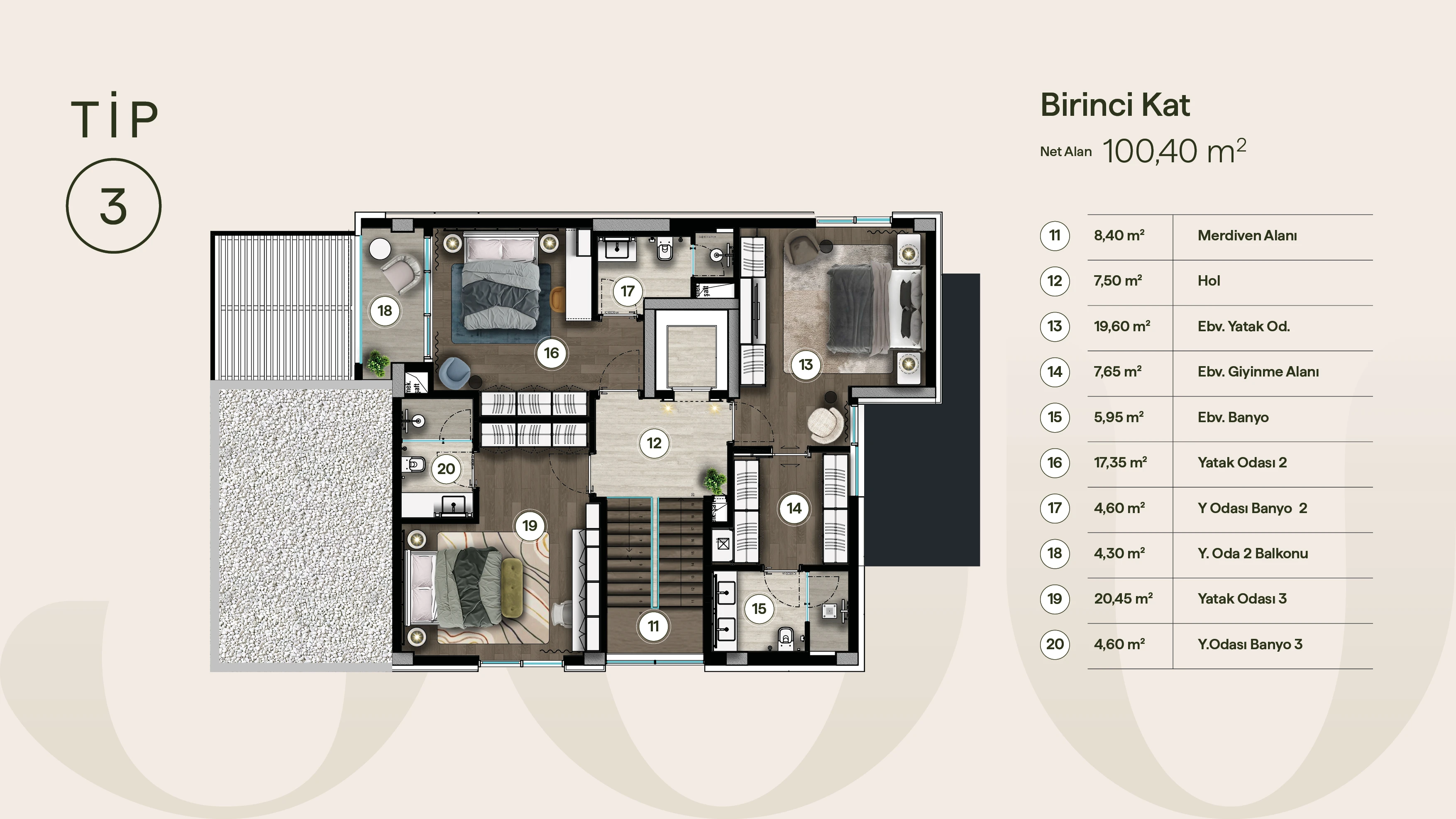Birinci katta ebeveyn süiti bağımsız bir yaşam adası gibi kurgulanırken, çocuk odaları ortak hol etrafında dengeli bir dağılım gösterir; her oda kendi banyosuna sahip olacak şekilde özel hayat mahremiyeti korunur.