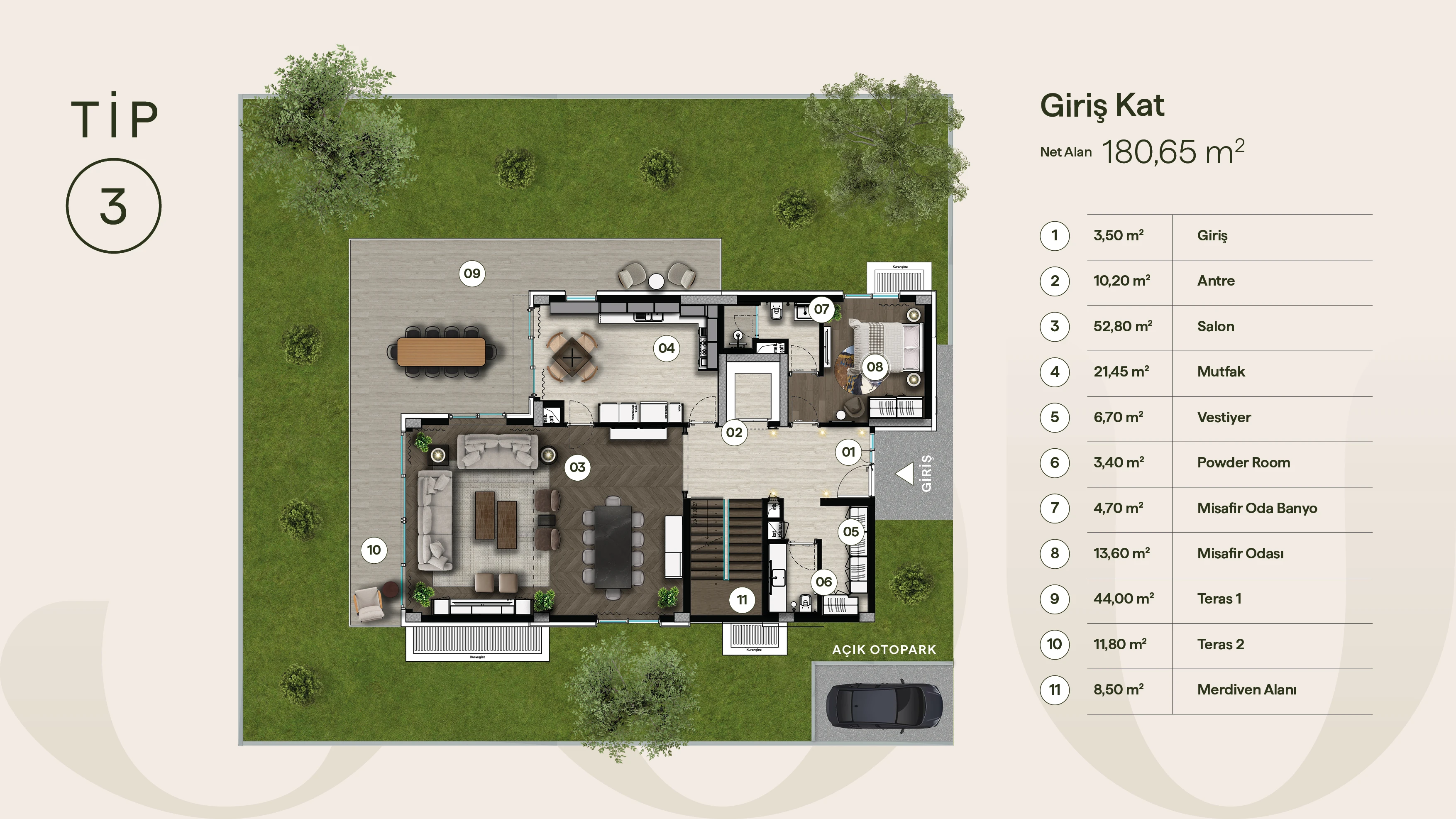 Giriş katta salon, yemek ve mutfak hacimleri teraslarla bütünleşen tek bir akış içinde çözülmüş; iç ve dış mekân sürekliliği mekânın merkezine alınmıştır. Giriş aksı, misafir odası ve servis hacimleri ana yaşam alanından dengeli biçimde ayrıştırılarak hem temsil gücü hem de gündelik kullanım konforu sağlanmıştır.